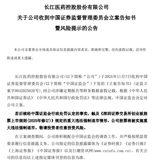 11月7日,*ST长药(300391)(300391.SZ)发布公告显示,公司于2025年11月7日收到中国证监会下发的《立案告知书》,因公司涉嫌定期报告等财务数据虚假记载,中国证监会决定对公司立案。若后续经中国证监会行政处罚认定的事实,触及重大违法强制退市情形,公司股票将被实施重大违法强制退市。公司将积极配合中国证监会的调查工作,并严格履行信息披露义务。