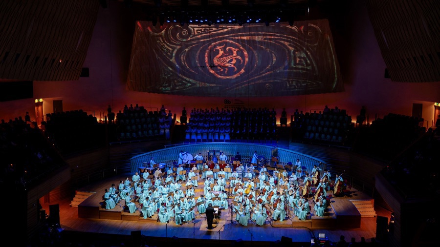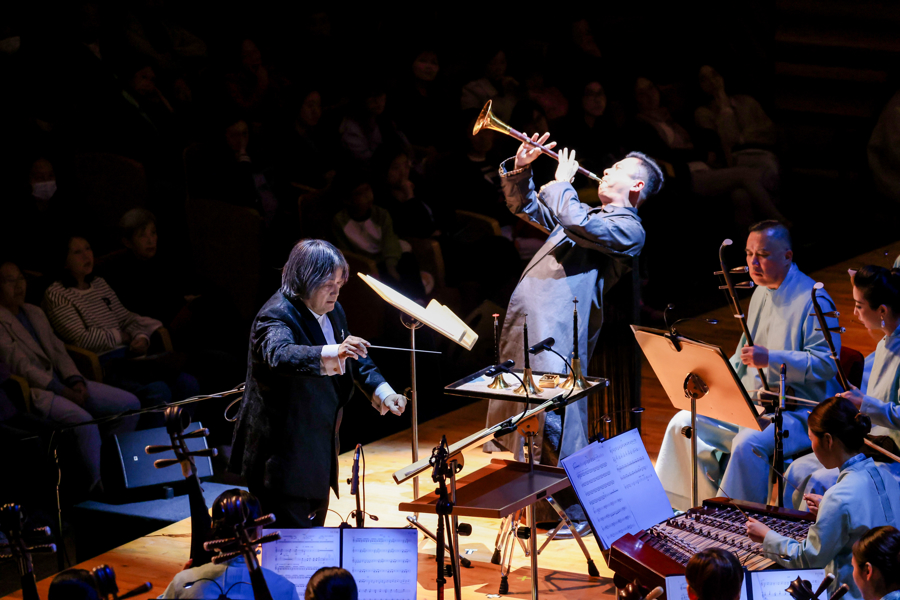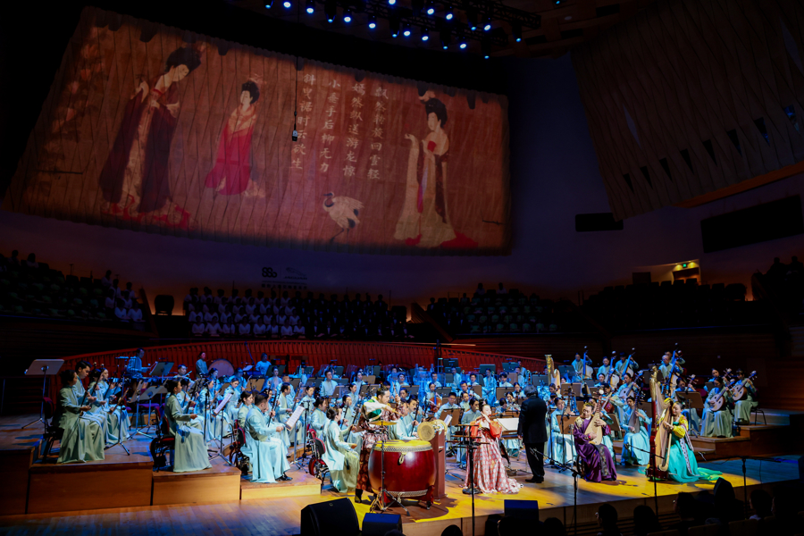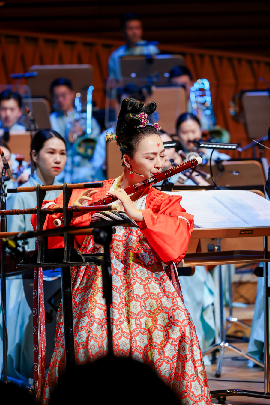随着旋律流转,《江河滔滔》用混声合唱与童声合唱的交织、乐队的雄浑演奏,铺展开“牧野洋洋”“与子同袍”的历史长卷。音乐在冲突与融合中前行,将华夏文明一次次内外交融的历程,转化为不断发展的内在动力,展现文明兼收并蓄的宽博胸襟。《朝日流霞》则画风一转,琵琶的清脆、笛子的悠扬、箜篌的空灵与人声的苍茫交相辉映,“胡旋若风,剑器如龙”的盛唐气象扑面而来,李白“天生我材必有用”的豪情在器乐对话中展现得淋漓尽致。