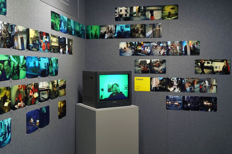 第四部分“时间玩具”是穿插于展览三大主题间的特别呈现,如电影彩蛋一般,以2010年代他用迷你果冻相机所拍摄的一批颇具玩味色彩的影像小品,将观众领进时光和记忆的房间。弄堂的一个场景,两张照片,三个人,三个方位,一个人在另一张照片中消失了,一个人还是不变的姿态,还有一个人眼睛望向了不同的方向。两张照片的对比,让我们感受到时间流逝带来的变与不变;父亲骑着车带着孩子在街上飞驰,孩子恣意地张开双臂,两张照片,不同角度地记录了这一时刻;另外一组则呈现了室内室外的不同景象。“时间玩具”里的图像,多为现在已不再能寻见的海派场景,颇为珍贵;再与当下对比,只要你仔细寻找这些照片中的同与不同,便能沉浸到他关于时空和视角的思考的影像世界里。